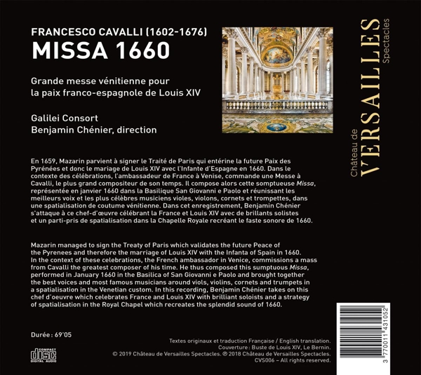 Beschreibung: | Mazarin managed to sign the Treaty of Paris which validates the future Peace of the Pyrenees, and therefore the marriage of Louis XIV with the Infanta of Spain in 1660. In the context of these celebrations, the French ambassador in Venice, commissions a mass from Cavalli the greatest composer of his time. He thus composed this sumptuous Missa performed in January 1660 in the Basilica of San Giovanni e Paolo and brought together the best voices and most famous musicians around viols, violins, cornets and trumpets in a spatialization in the Venetian custom. In this recording, Benjamin Chénier takes on this chef d'oeuvre which celebrates France and Louis XIV with brilliant soloists and a strategy of spatialization in the Royal Chapel which recreates the splendid sound of 1660., Runningtime: 00:00:00, Alto Vocals: Bertrand Dazin, Alto Vocals: Jean-Sébastien Beauvais, Alto Vocals, Solo Vocal: Pascal Bertin, Alto Vocals, Solo Vocal: Paulin Bündgen, Bass Vocals: David Witczak, Bass Vocals: Felipe Carrasco, Bass Vocals, Solo Vocal: Renaud Brès, Bass Vocals, Solo Vocal: Renaud Delaigue, Composed By: Francesco Cavalli, Directed By: Benjamin Chénier, Engineer: Manuel Mohino, Ensemble: Galilei Consort, Soprano Vocals: Danaé Monnié, Soprano Vocals: Jeanne Lefort, Soprano Vocals, Solo Vocal: Anne Magouët, Soprano Vocals, Solo Vocal: Stéphanie Révidat, Tenor Vocals: Benoît Porcherot, Tenor Vocals: Randol Rodriguez, Tenor Vocals, Solo Vocal: Martial Pauliat, Tenor Vocals, Solo Vocal: Vincent Bouchot, Labelcode CHAV6.2 (CVS006), Phonographic Copyright (p) Château de Versailles Spectacles, Copyright (c) Château de Versailles Spectacles, Recorded At Chapelle Royale De Versailles, Made By Arvato |