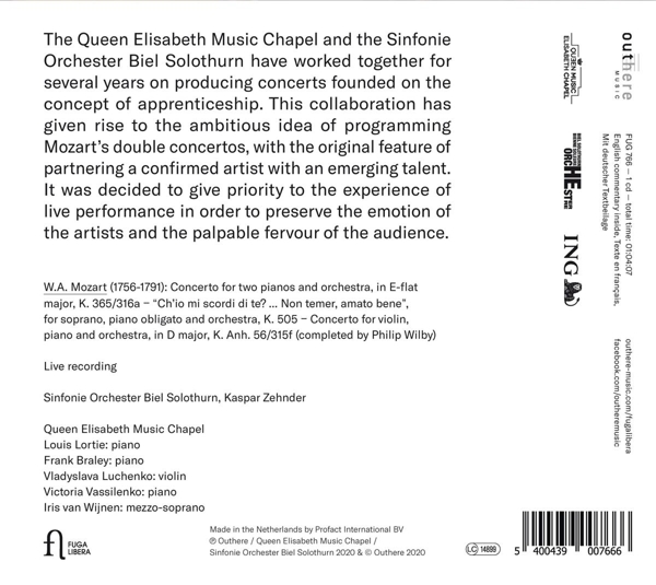 | Beschreibung: | The Queen Elisabeth Music Chapel and the Orchestre Symphonique Bienne Soleure have worked together for several years on producing concerts founded on the concept of apprenticeship, offering renowned artists and promising young musicians the possibility of a residency at the Music Chapel. This collaboration has given rise to the ambitious idea of programming Mozart's double concertos, with the original feature of partnering a confirmed artist- such as Frank Braley or Louis Lortie- with an emerging talent. The conductor Kaspar Zender and the Orchestre Symphonique Bienne Soleure gave their full commitment to his project which combines the wisdom of experience and youthful ardor, centering on a concert. It was therefore decided to give priority to the experience of live performance in order to preserve the emotion of the artists and the palpable fervor of the audience., Runningtime: 00:00:00, Composed By: Wolfgang Amadeus Mozart, Conductor: Kaspar Zehnder, Ensemble: Queen Elisabeth Chapel, Mezzo-soprano Vocals: Iris van Wijnen, Orchestra: Sinfonie Orchester Biel Solothurn, Piano: Frank Braley, Piano: Louis Lortie, Piano: Victoria Vassilenko, Violin: Vladyslava Luchenko, Labelcode FUGL766.2 (FUG766), Manufactured By Sony DADC Austria AG, Phonographic Copyright (p) Outhere, Phonographic Copyright (p) Queen Elisabeth Music Chapel, Phonographic Copyright (p) Sinfonie Orchester Biel Solothurn, Copyright (c) Outhere |