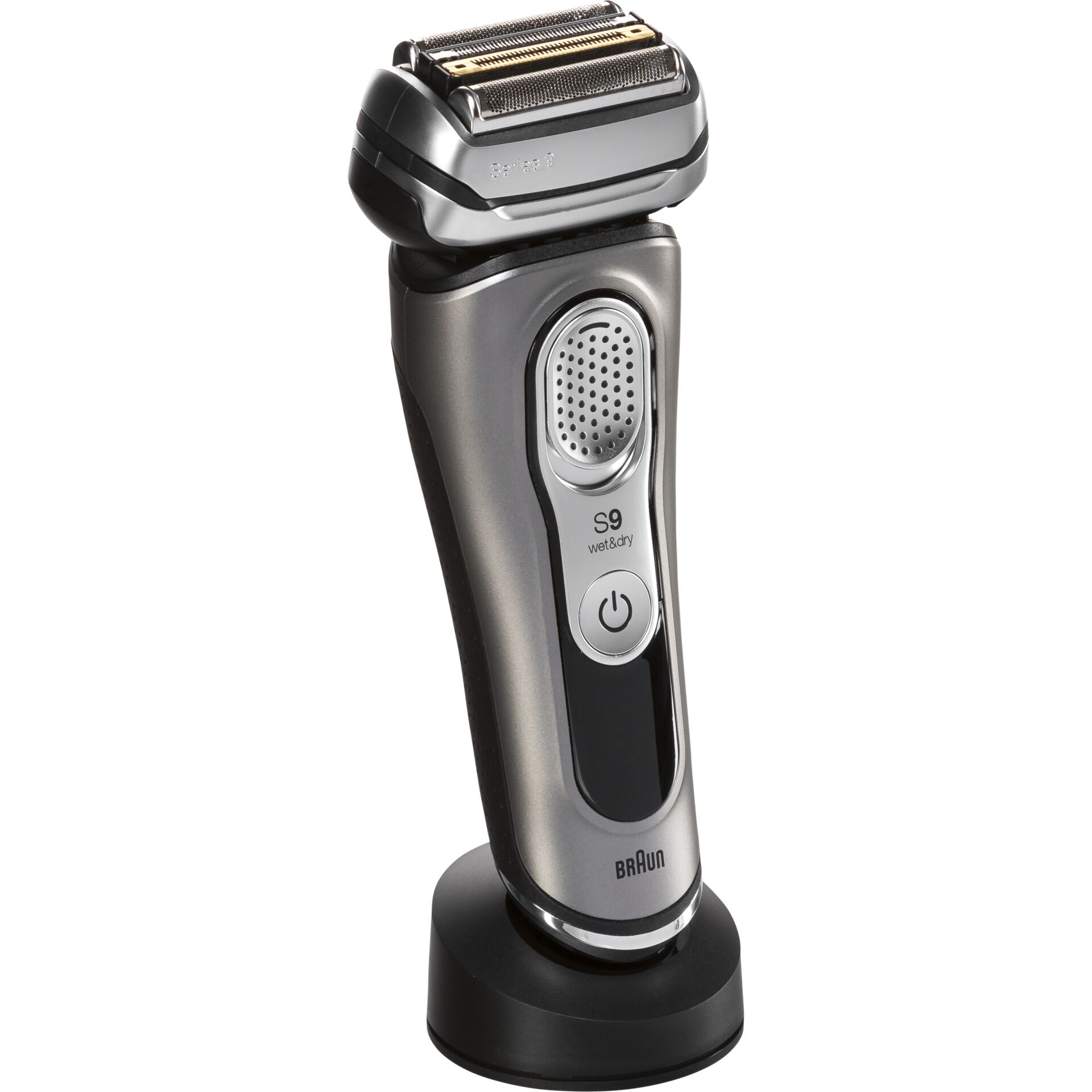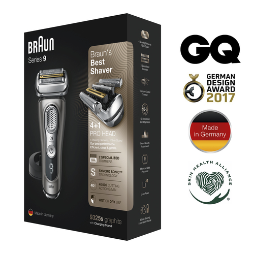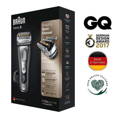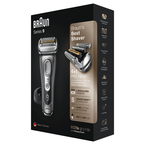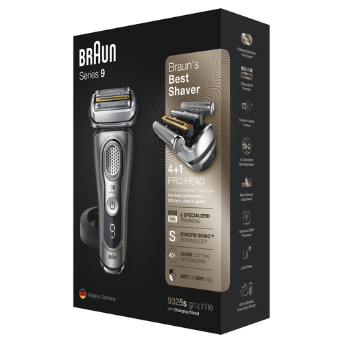 Der Braun Series 9 9325s ist ein hochwertiger kabelloser Rasierer für eine besonders gründliche und sanfte Rasur. Mit fünf synchronisierten Scherelementen ? darunter zwei spezielle Trimmer mit Titanbeschichtung ? erfasst dieses Modell mehr Haare in einem Zug als jeder andere Braun-Rasierer zuvor. Die innovative Sonic-Technologie sorgt mit bis zu 40.000 Schneidebewegungen pro Minute selbst bei dichten Bärten für exzellente Ergebnisse und außergewöhnlichen Komfort dank fortschrittlicher SkinGuard-Technologie sowie eines flexiblen Scherkopfes zur optimalen Anpassung an die Gesichtskonturen.