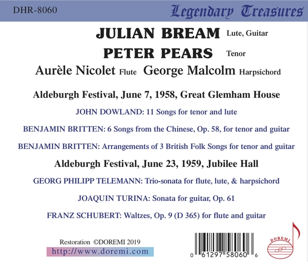 01. Pears, Peter "Flow my Tears" 02. Pears, Peter "Lachrimae (Pavane)" 03. Pears, Peter "Fantasie" 04. Pears, Peter "Now, o now I need must depart (Galliard)" 05. Pears, Peter "The King of Denmark, his Galliard" 06. Pears, Peter "What if I never speed?" 07. Pears, Peter "The Earl of Essex, his Galliard" 08. Pears, Peter "Can she excuse my wrongs (Galliard)" 09. Pears, Peter "Fine Knacks for Ladies (Galliard)" 10. Pears, Peter "If my complaints could passions move (Captain Digorie piper's galliard)" 11. Pears, Peter "Die not before thy day" Songs of the Chinese op. 58 Nr. 1-6 12. Pears, Peter "Nr. 1 Big Chariot" 13. Pears, Peter "Nr. 2 The old lute" 14. Pears, Peter "Nr. 3 The autumn wind" 15. Pears, Peter "Nr. 4 The herd boy" 16. Pears, Peter "Nr. 5 Depression" 17. Pears, Peter "Nr. 6 Dance song" Folk Songs (Volkslieder-Arrangements) Vol. 6 "England" 18. Pears, Peter "The shooting of his dear" 19. Pears, Peter "Master Kilby" 20. Pears, Peter "The soldier and the sailor" Konzert (Trio Sonate) für Fl?te, Violine und Basso continuo D-Dur TWV 42: D6 21. Pears, Peter "1. Piacevole" 22. Pears, Peter "2. Allegro" 23. Pears, Peter "3. Largo" 24. Pears, Peter "4. Vivace" Sonate für Gitarre op. 61 25. Bream, Julian "1. Allegro" 26. Bream, Julian "2. Andante" 27. Bream, Julian "3. Allegro vivo" 28. Nicolet, Aur?le "Walzer op. 9 (arr. für Fl?te und Gitarre)"