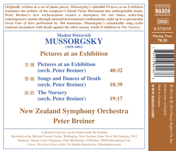 Originally written as a set of piano pieces, Mussorgsky's splendid Pictures at an Exhibition translates the artistry of the composer's friend Victor Hartmann into unforgettable music. Peter Breiner's new orchestration creates a showpiece for our times, achieving contemporary sounds through unusual instrumental combinations, and right up to a spectacular Great Gate of Kiev performed by 104 musicians. Mussorgsky's remarkable song cycles contrast encounters with death against the often uneasy world of children in the Nursery., Runningtime: 00:00:00, Labelcode NXS8573016.2
