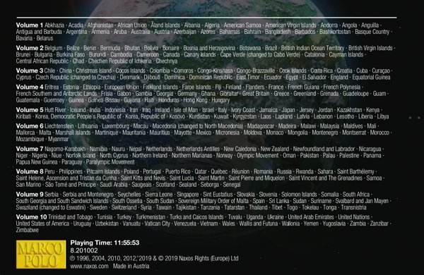 01. "Aiiaria (Nationalhymne von Abchasien)" 02. "Ave Maris Stella (Nationalhymne von Akadien)" 03. "Milli surood (Nationalhymne von Afghanistan)" 04. "Milli surood (Nationalhymne von Afghanistan) (kurze Fassung)" 05. "Soroud-e-melli (Nationalhymne von Afghanistan 1992-2006)" 06. "Soroud-e-melli (Nationalhymne von Afghanistan 1992-2006) (kurze Fassung)" 07. "Soroud-e-melli (Nationalhymne von Afghanistan 1978-1992)" 08. "Let us all unite and celebrate together (Nationalhymne der Afrikanischen Union)" 09. "l?nnigens s?ng (Nationalhymne der land-Inseln)" 10. "Hymni i flamurit (Nationalhymne von Albanien)" 11. "Kassaman (Nationalhymne von Algerien)" 12. "Kassaman (Nationalhymne von Algerien) (kurze Fassung)" 13. "Kassaman (Nationalhymne von Algerien) (olympische Fassung)" 14. "Amerika Samoa (Nationalhymne von Amerikanisch-Samoa)" 15. "Amerika Samoa (Nationalhymne von Amerikanisch-Samoa) (olympische Fassung)" 16. "Virgin Islands march (Nationalhymne der Amerikanischen Jungferninseln)" 17. "Virgin Islands march (Nationalhymne der Amerikanischen Jungferninseln) (olympische Fassung)" 18. "Virgin Islands march (Nationalhymne der Amerikanischen Jungferninseln) (kurze Fassung)" 19. "El gran Carlemany (Nationalhymne von Andorra)" 20. "El gran Carlemany (Nationalhymne von Andorra) (olympische Fassung)" 21. "Angola avante (Nationalhymne von Angola)" 22. "God bless Anguilla (Nationalhymne von Anguilla)" 23. "Fair Antigua, we salute thee (Nationalhymne von Antigua und Barbuda)" 24. "Himno nacional Argentino (Nationalhymne von Argentinien)" 25. "Himno nacional Argentino (Nationalhymne von Argentinien) (kurze Fassung)" 26. "Mer hayrenik (Nationalhymne von Armenien)" 27. "Aruba dush tera (Nationalhymne von Aruba)" 28. "Advance Australia fair (Nationalhymne von Australien)" 29. "Advance Australia fair (Nationalhymne von Australien) (olympische Fassung)" 30. "God save the Queen (Nationalhymne von Australien)" 31. "Bundeshymne (Nationalhymne von ?sterreich)" 32. "Bundeshymne (Nationalhymne von ?sterreich) (olympische Fassung)" 33. "Azerbaijan marsi (Nationalhymne von Aserbaidschan)" 34. "Azerbaijan marsi (Nationalhymne von Aserbaidschan) (olympische Fassung)" 35. "Hino dos A?ores (Nationalhymne der Azoren)" 36. "March on Bahamaland (Nationalhymne der Bahamas)" 37. "March on Bahamaland (Nationalhymne der Bahamas) (olympische Fassung)" 38. "Bahrainona (Nationalhymne von Bahrain)" 39. "Amar shonar Bangla (Nationalhymne von Bangladesch)" 40. "Barbados national anthem (Nationalhymne von Barbados)" 41. "Barbados national anthem (Nationalhymne von Barbados) (olympische Fassung)" 42. "God save the Queen (Nationalhymne von Barbados)" 43. "Basgortostan respublikahynyn d?wl?t himny (Nationalhymne von Baschkortostan)" 44. "Eusko abendaren ereserkia (Nationalhymne des Baskenlands)" 45. "Für Bayern" 46. "Dziarzauny himn Respubliki Bielarus (Nationalhymne von Weißrussland)" 47. "Dziarzauny himn Respubliki Bielarus (Nationalhymne von Weißrussland) (olympische Fassung)" 01. "La Braban?onne (Nationalhymne von Belgien)" 02. "Land of the free (Nationalhymne von Belize)" 03. "Land of the free (Nationalhymne von Belize) (olympische Fassung)" 04. "L'aube nouvelle (Nationalhymne von Benin)" 05. "Hail to Bermuda (Nationalhymne der Bermudas)" 06. "Hail to Bermuda (Nationalhymne der Bermudas) (kurze Fassung)" 07. "God save the Queen (Nationalhymne der Bermudas)" 08. "Druk tsendhen (Nationalhymne von Bhutan)" 09. "Druk tsendhen (Nationalhymne von Bhutan)" 10. "Canci¢n patri¢tica (Nationalhymne von Bolivien)" 11. "Tera di solo y suave biento (Nationalhymne von Bonaire)" 12. "Drzavna himna Bosne i Hercegovine (Nationalhymne von Bosnien und Herzegowina)" 13. "Drzavna himna Bosne i Hercegovine (Nationalhymne von Bosnien und Herzegowina) (olympische Fassung)" 14. "Jedna si jedina (Nationalhymne von Bosnien und Herzegowina 1992-1999)" 15. "Fatashe leno la rona (Nationalhymne von Botswana)" 16. "Hino nacional Brasilerio (Nationalhymne von Brasilien)" 17. "Hino nacional Brasilerio (Nationalhymne von Brasilien) (olympische Fassung)" 18. "Hino nacional Brasilerio (Nationalhymne von Brasilien) (kurze Fassung)" 19. "God save the Queen (Nationalhymne des britischen Territoriums im Indischen Ozeans)" 20. "God save the Queen (Nationalhymne der britischen Jungferninseln)" 21. "Allah peliharakan sultan (Nationalhymne von Brunei)" 22. "Mila rodino (Nationalhymne von Bulgarien)" 23. "Mila rodino (Nationalhymne von Bulgarien)" 24. "Le ditanye (Nationalhymne von Burkina Faso)" 25. "Le ditanye (Nationalhymne von Burkina Faso) (olympische Fassung)" 26. "Burundi bwacu (Nationalhymne von Burundi)" 27. "Burundi bwacu (Nationalhymne von Burundi) (olympische Fassung)" 28. "Nokoreach (Nationalhymne von Kambodscha)" 29. "Nokoreach (Nationalhymne von Kambodscha) (kurze Fassung)" 30. "O Cameroun, berceau de nos anc?stres (Nationalhymne von Kamerun)" 31. "O Canada (Nationalhymne von Kanada) (lange, langsame Fassung)" 32. "O Canada (Nationalhymne von Kanada) (kurze, schnelle Fassung)" 33. "O Canada (Nationalhymne von Kanada) (Fassug von 2005)" 34. "God save the Queen (Nationalhymne von Kanada)" 35. "Himno de Canarias (Nationalhymne der Kanaren)" 36. "C?ntico da liberdade (Nationalhymne von Kap Verde)" 37. "C?ntico da liberdade (Nationalhymne von Kap Verde) (olympische Fassung)" 38. "Els segadors (Nationalhymne von Katalonien)" 39. "Beloved Isles Cayman (Nationalhymne der Kaimaninseln)" 40. "Beloved Isles Cayman (Nationalhymne der Kaimaninseln) (olympische Fassung)" 41. "God save the Queen (Nationalhymne der Kaimaninseln)" 42. "La renaissance (Nationalhymne von Zentralafrika)" 43. "La Tchadienne (Nationalhymne des Tschad)" 44. "Jozalla ya marso (Nationalhymne der Tschetschenischen Republik Itschkerien)" 45. "The shatlak's song (Nationalhymne von Tschetschenien)" 01. "Himno nacional de Chile (Nationalhymne von Chile)" 02. "Himno nacional de Chile (Nationalhymne von Chile) (olympische Fassung)" 03. "Yiyongjun jnx¡ngqu (Nationalhymne der Volksrepublik China)" 04. "Adva