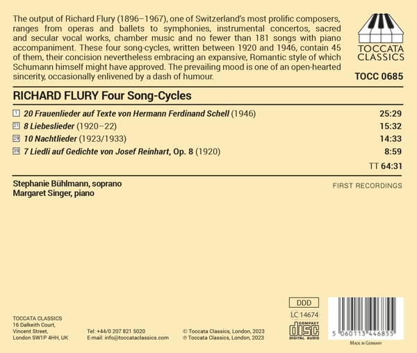 | Beschreibung: | The output of Richard Flury (1896-1967), one of Switzerland's most prolific composers, ranges from operas and ballets to symphonies, instrumental concertos, sacred and secular vocal works, chamber music and no fewer than 181 songs with piano accompaniment. These four song-cycles, written between 1920 and 1946, contain 45 of them, their concision nevertheless embracing an expansive, Romantic style of which Schumann himself might have approved. The prevailing mood is one of an open-hearted sincerity, occasionally enlivened by a dash of humour., Runningtime: 00:00:00, Labelcode TCCT685.2 |