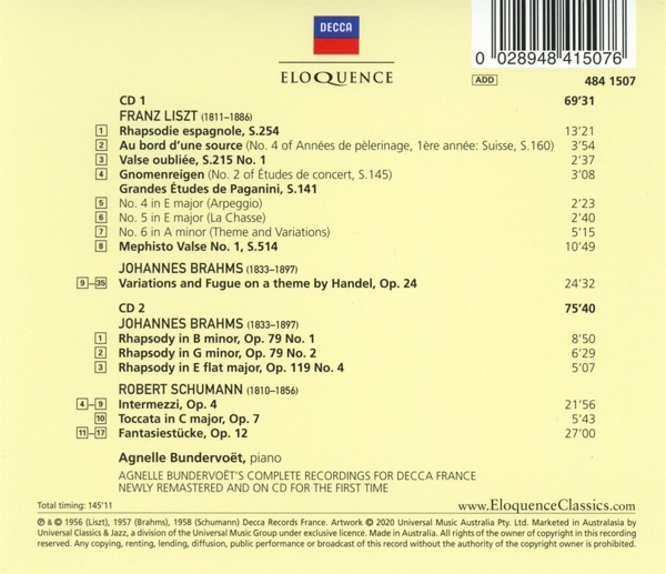 Disc 01 01. "Rhapsodie espagnole S 254" Ann?es de p?lerinage, 1e ann?e: Suisse S 160 (Auszug) 02. "Nr. 4 Au bord d'une source" 03. "Valse oubli?e Nr. 1 S 215,1" 04. "Gnomenreigen (Ronde des lutins) S 145" Grandes ?tudes de Paganini S 141 Nr. 1-6 (Auszug) 05. "Nr. 4 Etüde E-Dur (Arpeggio)" 06. "Nr. 5 Etüde E-Dur (La Chasse)" 07. "Nr. 6 Etüde a-moll (Thema und Variationen)" 08. "Mephisto-Walzer Nr. 1 (Der Tanz in der Dorfschenke) (Episode aus Lenaus Faust) (für Klavier)" Variationen und Fuge über ein Thema von Georg Friedrich H?ndel B-Dur op. 24 09. "1. Thema (Aria)" 10. "2. Variation 1" 11. "3. Variation 2: Animato" 12. "4. Variation 3: Dolce" 13. "5. Variation 4: Risoluto" 14. "6. Variation 5: Espressivo" 15. "7. Variation 6" 16. "8. Variation 7: Con vivacita" 17. "9. Variation 8" 18. "10. Variation 9: Poco sostenuto" 19. "11. Variation 10: Energico" 20. "12. Variation 11: Dolce" 21. "13. Variation 12: Soave" 22. "14. Variation 13: Largamente, ma non pi?" 23. "15. Variation 14: Sciolto" 24. "16. Variation 15" 25. "17. Variation 16: Ma marcato" 26. "18. Variation 17: Pi? mosso" 27. "19. Variation 18: Grazioso" 28. "20. Variation 19: Leggiero" 29. "21. Variation 20: Legato" 30. "22. Variation 21: Dolce" 31. "23. Variation 22" 32. "24. Variation 23: Vivace e staccato" 33. "25. Variation 24" 34. "26. Variation 25" 35. "27. Fuge"