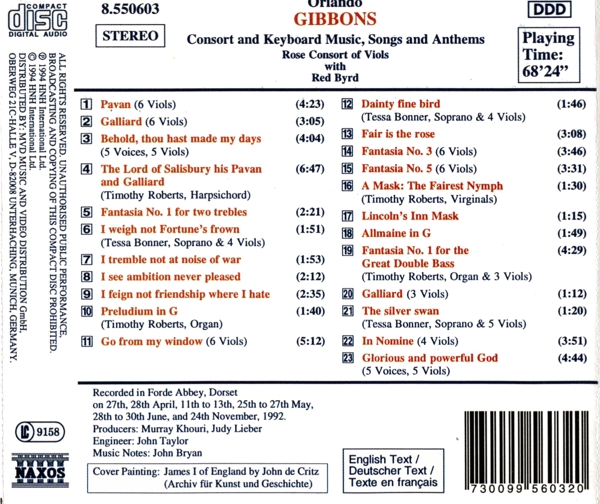| | Beschreibung: | Runningtime: 00:00:00, Composed By: Orlando Gibbons, Engineer: John Taylor (13), Ensemble: Red Byrd, Ensemble: Rose Consort Of Viols, Liner Notes [Music Notes]: John Bryan (3), Painting [Cover Painting]: John de Critz, Producer: Judy Lieber (2), Producer: Murray Khouri, Viol: Alison Crum, Viol: Elizabeth Liddle, Viol: John Bryan (3), Viol: Julia Hodgson, Viol: Mark Caudle, Viol: Roy Marks, Viol: Susanna Pell, Vocals: Caroline Trevor, Vocals: Henry Wickham, Vocals: Ian Honeyman, Vocals: John Potter (2), Vocals: Penny Vickers, Vocals: Richard Wistreich, Harpsichord: Timothy Roberts, Soprano Vocals: Tessa Bonner, Organ: Timothy Roberts, Soprano Vocals: Tessa Bonner, Harpsichord [Virginals]: Timothy Roberts, Organ: Timothy Roberts, Soprano Vocals: Tessa Bonner, Labelcode NXS8550603.2 (8.550603), Distributed By MVD Music And Video Distribution GmbH, Phonographic Copyright (p) HNH International Ltd., Copyright (c) HNH International Ltd., Copyright (c) John Bryan, Recorded At Forde Abbey, Glass Mastered At Sonopress |  | | Anzahl der Titel: |