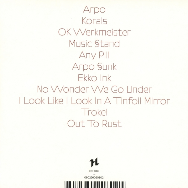 01. "Arpo" 02. "Korals" 03. "OK Werkmeister" 04. "Music stand" 05. "Any pill" 06. "Arpo sunk" 07. "Ekko ink" 08. "No wonder we go under" 09. "I look like I look in a tinfoil mirror" 10. "Trokel" 11. "Out to rust"
