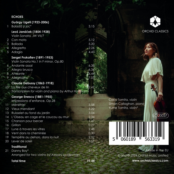 01. Tomita, Coco "Balada si joc" Sonate für Violine und Klavier 02. Tomita, Coco "1. Con moto" 03. Tomita, Coco "2. Ballade" 04. Tomita, Coco "3. Allegretto" 05. Tomita, Coco "4. Adagio" Sonate für Violine und Klavier Nr. 1 f-moll op. 80 06. Tomita, Coco "1. Andante assai" 07. Tomita, Coco "2. Allegro brusco" 08. Tomita, Coco "3. Andante" 09. Tomita, Coco "4. Allegrissimo" 10. Tomita, Coco "La fille aux cheveux de lin (transkr. für Violine und Klavier von Arthur Hartmann)" Impressions d'enfance op. 28 11. Tomita, Coco "M?n?trier" 12. Tomita, Coco "Vieux mendiant" 13. Tomita, Coco "Ruisselet au fond du jardin" 14. Tomita, Coco "L'Oiseau en cage et le coucou au mur" 15. Tomita, Coco "Chanson pour bercer" 16. Tomita, Coco "Grillon" 17. Tomita, Coco "Lune ? travers les vitres" 18. Tomita, Coco "Vent dans la chemin?e" 19. Tomita, Coco "Temp?te au dehors, dans la nuit" 20. Tomita, Coco "Lever de soleil" 21. Tomita, Yume "Danny boy (bearb. für 2 Violinen von Alexsey Igudesman)"