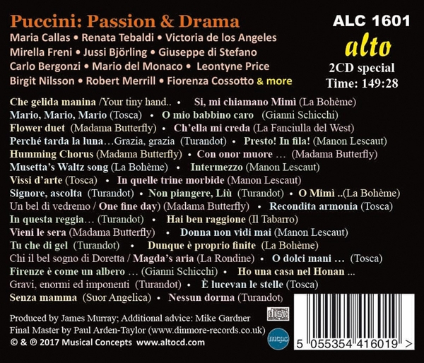 Disc 01 La Boh?me (Oper in 4 Akten) (Auszug) 01. Tebaldi, Renata "Che gelida manina" 02. Tebaldi, Renata "Si, mi chiamano Mim" Tosca (Oper in 3 Akten) (Auszug) 03. Di Stefano, Giuseppe "Mario, Mario, Mario" Gianni Schicchi (Oper in 1 Akt) (Auszug) 04. Freni, Mirella "O mio babbino caro" Madama Butterfly (Madame Butterfly, Oper in 3 Akten) (Auszug) 05. Tebaldi, Renata "Scuoti quella fronda di cillegio" La Fanciulla del West (Das M?dchen aus dem goldenen Westen, Oper in 3 Akten) (Auszug) 06. Del Monaco, Mario "Ch'ella mi creda" Turandot (Oper in 3 Akten) (Auszug) 07. Bj?rling, Jussi "Perch? tarda la luna... Grazia, grazia" Manon Lescaut (Oper in 4 Akten) (Auszug) 08. Bj?rling, Jussi "Presto! In fila! No Pazzo son" Madama Butterfly (Madame Butterfly, Oper in 3 Akten) (Auszug) 09. Tebaldi, Renata "Coro a bocca chiusa" 10. Tebaldi, Renata "Con onor muore..." La Boh?me (Oper in 4 Akten) (Auszug) 11. D'Angelo, Gianna "Quando m'en vo" Manon Lescaut (Oper in 4 Akten) (Auszug) 12. Karajan, Herbert von "Intermezzo" Tosca (Oper in 3 Akten) (Auszug) 13. Callas, Maria "Vissi d'arte" Manon Lescaut (Oper in 4 Akten) (Auszug) 14. Tebaldi, Renata "In quelle trine morbide" Turandot (Oper in 3 Akten) (Auszug) 15. Tozzi, Giorgio "Signore, ascolta" 16. Tozzi, Giorgio "Non piangere, Li?..."
