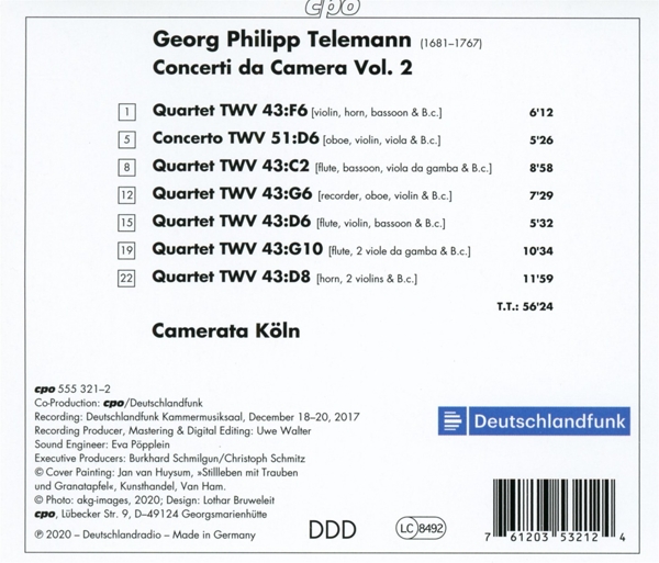 Beschreibung:Georg Philipp Telemann's chamber oeuvre has always had a significant place in the repertoire of the Camerata Köln. The ensemble's contributions to this field have included complete recordings of magnificent cyclical work groups such as his Essercizii musici, Trios of 1718, Six Concerts et Suites, Die kleine Kammermusik, and Der getreue Music-Meister. The present release rounds off the complete recording of Telemann's concertos with wind instruments on a total of 16 albums on cpo. The Baroque orchestra La Stagione Frankfurt led by Michael Schneider performed the orchestral compositions, and the Camerata Köln was responsible for the chamber works - and the wind soloists of the two ensembles are identical. The second release of the Concerti da Camera once again contains chamber masterpieces by Telemann featuring a complex texture of parts in a concerto style in which each of the concertizing instruments is allowed to come forward with thematic material as well as with figurations., Runningtime: 00:00:00, Labelcode CPO555321.2