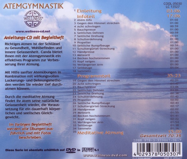Beschreibung:Atemgymnastik - Stress-Abbau mit meditativer Atmung / Hörbuch Die Atemgymnastik ist ein äußerst effektives Programm für körperliche und geistige Entspannung, da es auf ganz schonende Weise unser biologisches Gleichgewicht herstellt und festigt. Grundlegend für die Atemgymnastik sind Atemübungen, die mit wirkungsvollen Lockerungs- und Dehnungsübungen kombiniert werden. Im farbigen Begleitheft werden dieÜbungen ausführlich und mit Fotos beschrieben.