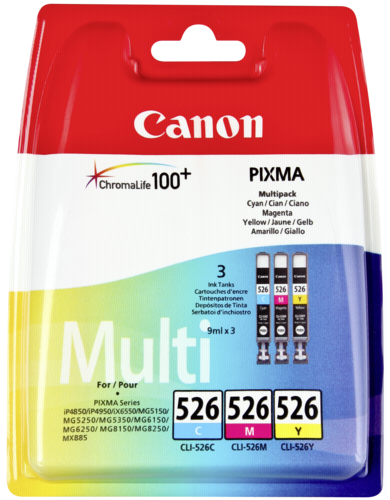 Canon CLI-526 C/M/Y Pack. Typ: Original, Tintentyp: Tinte auf Pigmentbasis, Druckfarben: Cyan, Magenta, Gelb