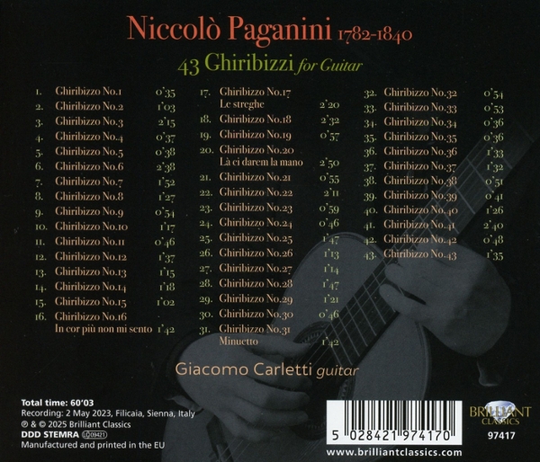 Beschreibung:A new recording of Paganini's eccentric 'diary of invention' for guitar by a young Italian musician with a fast-growing reputation in both rock and classical genres. Giacomo Carletti took up the guitar at the age of 13, initially playing electric. Impressed by his talent, the composer Edoardo Catemario encouraged Carletti to take up the classical guitar. He now makes his career as a busy recitalist with the classical instrument while keeping up his pop and rock connections by playing electric guitar in several bands. As Carletti remarks in his booklet essay for his debut album on Brilliant Classics, the 43 Ghiribizzi by Paganini stand as a testament to his musical ingenuity and sense of fun. They present a showcase for his technical prowess but also reveal a lighter side to the virtuoso often caricatured as a dark and forbidding figure. The term Ghiribizzo is defined in Italian as an 'Idea bizzarra, capriccio improvviso'. Many less than a minute long, the 43 sketches sometimes start and stop abruptly; some are hardly more than tunes, others are eccentric fantasies. Many of them are based on existing material - not only the Mozart aria 'La ci darem la mano' from Don Giovanni, which Paganini acknowledges in the score, but other tunes he picked up on the way, popular and folkloristic, often anonymous in origin. No.37 of the collection has an esspecially rich back-story: a fond musical memory of Paganini's meeting with Rossini in Naples, in 1820. The piece, divided into two parts, bears Rossini's name at the bottom of the first 16 bars, and Paganini's at the bottom of the next 16, perhaps as a recollection of a game where they improvised together.'in recording the Ghiribizzi,' says Carletti, 'I wanted to bring out the eccentric and eclectic character of the composer. I try to imagine Paganini as a rock virtuoso of nowadays and treat his music accordingly.'- Niccolo Paganini (1782-1840) is perhaps best known for his 24 Caprices for Solo Violin which granted him the fame as the diabolical virtuoso of his age. However, his contributions to the guitar world are equally fascinating, particularly his 43 Ghiribizzi. - In the dictionary of the Italian language the word Ghiribizzo is described as follows: "Idea bizzarra, capriccio improvviso" (bizarre idea, capricious improvisation). The artist Giacomo Carletti about the recording: "Bearing this precise and unequivocal definition in mind, in recording the 43 Ghiribizzi for guitar I wanted to bring out the eccentric and eclectic character of the composer. I try to imagine Paganini as a present day rock virtuoso and treat his music accordingly. Every rhythmical variation, every single notation has been studied, evaluated and decided in the awareness of wanting to make this integral as realistic as possible to what could have been a performance by Paganini himself. On this album you can hear hilarious tunes alternating, even in the same piece, with thoughtful, profound parts. Although there is no evidence of concerts held by the Italian maestro with the guitar, it is well known that Paganini studied and knew how to play the guitar with great mastery."- Giacomo Carletti plays in a wide variety of genres and styles, alternating performances in rock and pop bands with classical guitar solo and chamber concerts., Labelcode BRLT97417.2