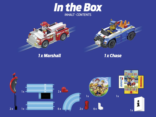 Beschreibung:PAW Patrol Carrera Bahn mit Chase und MarshallPAW PAtrol Carrera FIRSTKreisel für extra Spi elspaßcoole Streckendekoration mit offizieller PAW Patrol LizenzAb 3 Jahren Deine Freunde und Helfer mit vier Pfoten - jetzt auch auf der Rennbahn!Begib dich mit deinen vierbeinig en Freunden auf die Carrera Bahn der PAW Patrol. Erlebe die aufregende Welt der PAW Patrol und lasse dich vom Rennfieber packen! Die Fellnasen der PAW Patrol sind in der Kinderserie gefeierte Helden. Sie sind immer zur Stelle, wenn es darum geht, Menschen in Not zu helfen, Probleme zu lösen ode r alltägliche Angelegenheiten zu meistern. Jedes Mitglied der PAW Patrol hat nicht nur seinen e inzigartigen Charakter, sondern auch ein individuelles Fortbewegungsmittel - und was wäre da pa ssender als ein Rennen? Wer ist schneller zur Stelle, wenn es brenzlig wird?Jetzt stellt sich nur noch die Frage: Wer von den mutigen Hunden wird der Gewinner sein? Finde es heraus, indem d u den tollpatschigen Dalmatiner Marshall mit seinem Feuerwehrauto gegen den sportlichen Schäfer hund Chase mit seinem Polizeiwagen antreten lässt. Die beiden Slotcars im Maßstab 1:50 li efern sich auf der 2,4 Meter langen PAW Patrol Carrera Bahn ein actiongeladenes Duell und flitzen da bei an typischer Streckendekoration vorbei - einfach richtig cool!Jedes Kart mit den niedlichen Hündchen muss auf der Strecke pro Runde einen Kreisel durchqueren. Dieser sorgt für einen zu sätzlichen Spaßfaktor und lässt die Spannung steigen. Dank der offiziellen PAW Patro l-Lizenz erstrahlt das Carrera FIRST Set in einem tollen Design, das jeden kleinen Rennfahrer in die Welt der tapferen Hundeteams eintauchen lässt. Die beiden kinderfreundlichen Handregler geben dir die volle Kontrolle über die Fahrzeuge, und die batteriebetriebenen Funktionen garantieren eine realistische Rennerfahrung. An die Handregler, fertig, los! Mit den PAW Patrol Carre ra Autos wirst du super viel Spaß haben und deine eigenen Rennabenteuer mit Chase und Marshall erleben. Der tollpatschige Dalmatiner rast mit seinem Feuerwehrauto los, wenn er zum Einsatz fä hrt. Während der sportliche Schäferhund mit seinem Polizeiauto die Verfolgung aufnimmt. Also, nichts wie los - schnapp dir die Paw Patrol Carrera Bahn und lass die Hunde los! Falls du noch mehr über deine Helden der PAW Patrol erfahren möchtest, schaue dich einfach in unserer u mfangreichen PAW Patrol Themenwelt um!