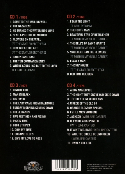 : CD 1 / 1968 () 1-1: Come To The Wailing Wall () 1-2: The Nazarene () 1-3: He Turned The Water Into Wine () 1-4: Send A Picture Of Mother () 1-5: Flowers On The Wall () 1-6: How Great Thou Art () 1-7: Daddy Sang Bass () 1-8: The Ten Commandments () 1-9: Where Could I Go But To The Lord () : CD2 / 1968 () 2-1: I Saw The Light () 2-2: The Forth Man () 2-3: Beautiful Star Of Bethlehem () 2-4: The Bell's Of Saint Mary's () 2-5: Sweeter Than The Flowers () 2-6: I Saw A Man () 2-7: This Ol'House () 2-8: Old Time Religion () : CD 3 / 1975 () 3-1: Ring Of Fire () 3-2: Man In Black () 3-3: Big River () 3-4: The Lady Came From Baltimore () 3-5: Sunday Morning Coming Down () 3-6: These Hands () 3-7: Five Feet High And Rising () 3-8: Pickin' Time () 3-9: I Got Stripes () 3-10: Doin' My Time () 3-11: Cocaine Blues () 3-12: Give My Love To Rose () : CD 4 / 1975 () 4-1: A Boy Named Sue () 4-2: The Night They Drove Old Dixie Down () 4-3: The City Of New Orleans () 4-4: Wreck Of The Old 97 () 4-5: Orange Blossom Special () 4-6: I Still Miss Someone () 4-7: Jackson () 4-8: IF I Were A Carpenter () 4-9: It Ain't Me Babe () 4-10: Will The Circle Be Unbroken () 4-11: I Walk The Line ()