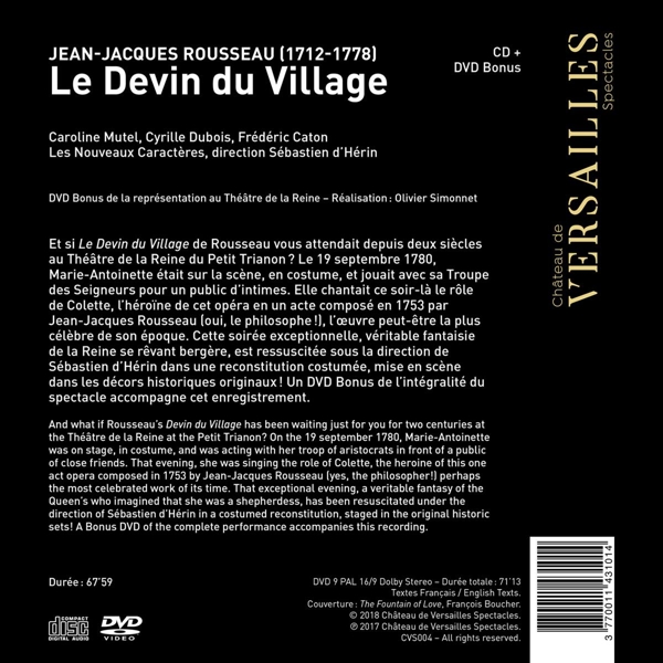 | Beschreibung: | Perhaps Jean-Jacques Rousseau's Devin du Village has been waiting just for you for two centuries at the Theatre de la Reine at the Petit Trianon. On September 19, 1780, Marie-Antoinette was on stage, in costume, and was acting with her troop of aristocrats in front of a public of close friends. That evening, she was singing the role of Colette, the heroine of this one act opera composed in 1753 by the philosopher Jean-Jacques Rousseau, perhaps the most celebrated work of it's time. That exceptional evening, a veritable fantasy of the Queen's who imagined that she was a shepherdess, has been resuscitated under the direction of Sebastien d'Herin in a costumed reconstitution, staged in the original historic sets. A bonus film of the complete performance accompanies this recording., Runningtime: 00:00:00, Choir: Caroline Arnaud, Choir: Edouard Hazebrouck, Choir: Jérémie Delvert, Choir: Marie Picaut, Choir: Thi Lien Truong, Composed By: Jean-Jacques Rousseau, Directed By, Harpsichord: Sébastien d'Hérin, Engineer [Prise de son], Producer [Direction artistique]: Olivier Rosset (2), Orchestra: Les Nouveaux Caractères, Solo Vocal [Colette]: Caroline Mutel, Solo Vocal [Colin]: Cyrille Dubois, Solo Vocal [le Devin]: Frédéric Caton, Labelcode CHAV4.2 (CVS004), Phonographic Copyright (p) Château de Versailles Spectacles, Copyright (c) Château de Versailles Spectacles, Made By Arvato, Made By Arvato |
