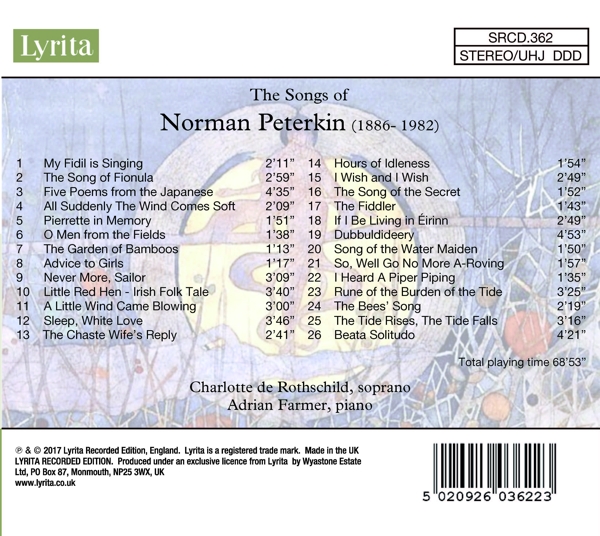 03. "Five poems from the Japanese" 04. "All suddenly the wind comes soft" 05. "Pierrette in memory" 06. "O men from the fields" 07. "The garden of bamboos" 08. "Advice to girls" 09. "Never more, sailor" 10. "Little red hen - Irish folk tale" 11. "A little wind came blowing" 12. "Sleep, white love" 13. "The chaste wife's reply" 14. "Hours of idleness" 15. "I wish and I wish" 16. "The song of the secret" 17. "The fiddler" 18. "If I be living in irinn" 19. "Dubbuldideery" 20. "Song of the water maiden" 21. "So, well go no more a-roving"