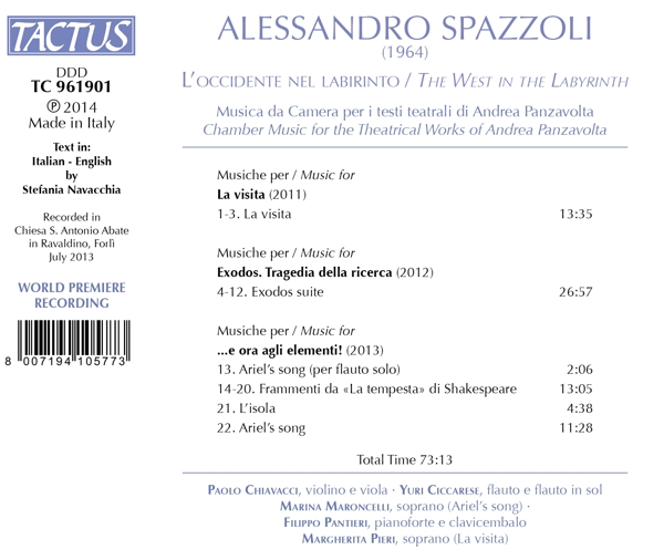 La visita (3 Lieder für Sopran, Fl?te, Klavier und Cembalo) 01. Chiavacci, Paolo "Nr. 1 Da poi che il fato" 02. Chiavacci, Paolo "Nr. 2 Che suono, che ritmo!" 03. Chiavacci, Paolo "Nr. 3 Io voglio del ver" Exodus suite (für Fl?te und Klavier) 04. Ciccarese, Yuri "1. Achab" 05. Ciccarese, Yuri "2. Oidipous" 06. Ciccarese, Yuri "3. Inesprimibile sarebbe il Dio" 07. Ciccarese, Yuri "4. Fumo ? ogni cosa" 08. Ciccarese, Yuri "5. Canzone 1" 09. Ciccarese, Yuri "6. Canzone 2" 10. Ciccarese, Yuri "7. Job" 11. Ciccarese, Yuri "8. A questo grido" 12. Ciccarese, Yuri "9. Qui non c'? ascolto" 13. Ciccarese, Yuri "10. Ariel's song" Fragmente aus La Tempesta von Shakespeare (für Violine, Klavier und Cembalo) 14. Chiavacci, Paolo "1. Prospero" 15. Chiavacci, Paolo "2. Calibano" 16. Chiavacci, Paolo "3. Miranda" 17. Chiavacci, Paolo "4. Ferdinando" 18. Chiavacci, Paolo "5. Trinculo" 19. Chiavacci, Paolo "6. Antonio" 20. Chiavacci, Paolo "7. Monologo finale" 21. Chiavacci, Paolo "L'isola (für 2 Fl?ten, Viola, Klavier und Cembalo)" 22. Chiavacci, Paolo "Ariel's song (für Sopran, Viola und Klavier)"