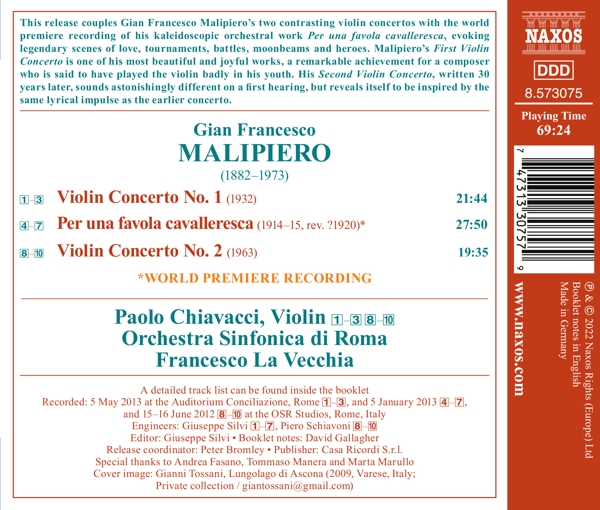 Beschreibung:This release couples Gian Francesco Malipiero's two contrasting violin concertos with the world premiere recording of his kaleidoscopic orchestral work Per una favola cavalleresca, evoking legendary scenes of love, tournaments, battles, moonbeams and heroes. Malipiero's First Violin Concerto is one of his most beautiful and joyful works, a remarkable achievement for a composer who is said to have played the violin badly in his youth. His Second Violin Concerto, written 30 years later, sounds astonishingly different on a first hearing, but reveals itself to be inspired by the same lyrical impulse as the earlier concerto., Runningtime: 00:00:00, Composed By: Gian Francesco Malipiero, Conductor: Francesco La Vecchia, Coordinator [Release Coordinator]: Peter Bromley (2), Cover [Image]: Gianni Tossani, Editor: Giuseppe Silvi, Engineer: Giuseppe Silvi, Engineer: Piero Schiavoni, Liner Notes: David Gallagher (2), Orchestra: Orchestra Sinfonica Di Roma, Violin: Paolo Chiavacci, Labelcode NXS8573075.2 (8.573075), Phonographic Copyright (p) Naxos Rights Europe Ltd, Copyright (c) Naxos Rights Europe Ltd, Published By Casa Ricordi SRL, Milano, Recorded At Auditorium Conciliazione, Recorded At OSR Studios, Rome, Glass Mastered At Sonopress
