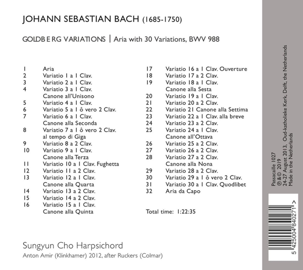 Beschreibung:Bach's Goldberg Variations are one of the masterpieces of piano music of which harpsichordists and pianists alike would like to present their "personal version". The version by Korean harpsichordist Sungyun Cho is characterized by poetic approach, fluent playing and the ability to build a unifying and lasting tension. SUNGYUN CHO began her musical studies in Seoul, South Korea, at the Seoul Arts High School, and at the Yonsei University with Professor Kwak Tongsoon. From there she went to the Royal Conservatory of The Hague where she studied harpsichord performance and chamber music with such internationally renowned pedagogues as Jacques Ogg, Patrick Ayrton, and Ryo Terakado. Throughout her studies, she performed across Europe as a soloist and chamber musician, and she completed her program in The Hague with the highest marks and distinction. After graduation, Cho's career grew rapidly, and she quickly drew the attention of many around the world., Runningtime: 00:00:00, Composed By: Johann Sebastian Bach, Harpsichord: Sungyun Cho, Labelcode PASS1027.2 (PAS 1027)