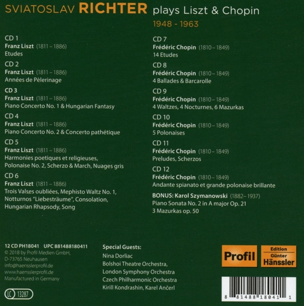 Disc 03 01. Richter, Svjatoslav "Konzert für Klavier und Orchester Nr. 1 Es-Dur S 124" 02. Richter, Svjatoslav "Hungarian Fantasy S 123 (Fantasie über ungarische Volksmelodien für Klavier und Orchester)" 03. Richter, Svjatoslav "Konzert für Klavier und Orchester Nr. 1 Es-Dur S 124"