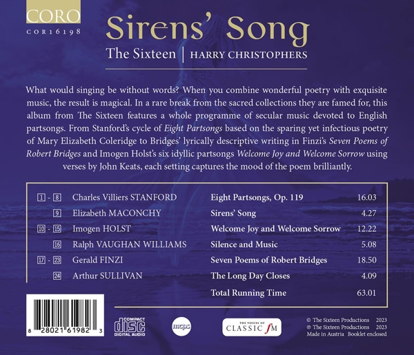 Beschreibung:What would singing be without words? When you combine wonderful poetry with exquisite music, the result is magical. In a rare break from the sacred collections they are famed for, this album from The Sixteen features a whole programme of secular music devoted to English partsongs. From Stanford's cycle of Eight Partsongs based on the sparing yet infectious poetry of Mary Elizabeth Coleridge to Bridges' lyrically descriptive writing in Finzi's Seven Poems of Robert Bridges and Imogen Holst's six idyllic partsongs Welcome Joy and Welcome Sorrow using verses by John Keats, each setting captures the mood of the poem brilliantly., Runningtime: 00:00:00, Labelcode CORO16198C.2