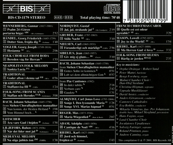 | Beschreibung: | Runningtime: 00:00:00, : , Composed By: Gunnar Wennerberg, Composed By: Georg Friedrich Händel, Composed By: Georg Joseph Vogler, Composed By: Traditional, Composed By: Traditional, Composed By: Traditional, Composed By: Traditional, Composed By: Traditional, Composed By: Johann Sebastian Bach, Composed By: Johann Sebastian Bach, Composed By: Johan Georg Lotscher, Composed By: Ruben Liljefors, Composed By: Traditional, Composed By: Gustaf Nordqvist, Composed By: Franz Gruber, Composed By: Carl Nielsen, Composed By: Jean Sibelius, Composed By: Johann Sebastian Bach, Composed By: Johann Sebastian Bach, Composed By: Piae Cantiones, Composed By: Piae Cantiones, Composed By: Piae Cantiones, Composed By: Carl Jonas Love Almqvist, Composed By: Carl Jonas Love Almqvist, Composed By: Max Reger, Composed By: Adolphe C. Adam, Composed By: Carl Riedel, Composed By: Traditional, Arranged By: John Rutter, Composed By: Lowell Mason, Composed By: Carl Riedel, Composed By: Traditional, Labelcode BIS1179.2 (BIS-CD-1179, CD-1179) |  | Produzent: |