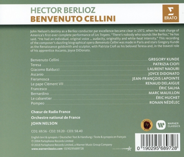 Disc 01 Benvenuto Cellini op. 23 (Oper in 2 Akten) (Gesamtaufnahme) 01. John Nelson/Orchestre National de France/Patrizia Ciofi/Gregory Kunde/Laurent Naouri/Marc Mauillon/Jean-Fran?ois Lapoint "Ouvertüre" Benvenuto Cellini, Act 1 - Premier Tableau, Scene 1: Introduction - Teresa!...mais ou peut elle etre (Balducci/Teresa) 02. John Nelson/Orchestre National de France/Patrizia Ciofi/Laurent Naouri/Gregory Kunde/Marc Mauillon/Jean-Fran?ois Lapoint "Teresa! Mais o? peut-elle ?tre? (1. Akt)" Benvenuto Cellini, Act 1 - Premier Tableau, Scene 1: Air - Ne regardez jamais la lune (Balducci) 03. John Nelson/Orchestre National de France/Laurent Naouri/Patrizia Ciofi/Gregory Kunde/Marc Mauillon/Jean-Fran?ois Lapoint "Ne regardez jamais la lune" Benvenuto Cellini, Act 1 - Premier Tableau, Scene 1: Choeur de masques - Enfin il est sorti (Teresa/Balducci/Cellini/Cho 04. John Nelson/Orchestre National de France/Patrizia Ciofi/Laurent Naouri/Gregory Kunde/Marc Mauillon/Eric Salha/Jean-Fran? "Enfin il est sorti" Benvenuto Cellini, Act 1 - Premier Tableau, Scene 2: R?cit - Les bells fleurs!... (Teresa) 05. John Nelson/Orchestre National de France/Patrizia Ciofi/Gregory Kunde/Laurent Naouri/Marc Mauillon/Jean-Fran?ois Lapoint "Les belles fleurs!" Benvenuto Cellini, Act 1 - Premier Tableau, Scene 2: Romance - Ah! que l'amour une fois dans le coeur (Teresa) 06. John Nelson/Orchestre National de France/Patrizia Ciofi/Gregory Kunde/Laurent Naouri/Marc Mauillon/Jean-Fran?ois Lapoint "Ah! Que l'amour une fois dans le c ur" Benvenuto Cellini, Act 1 - Premier Tableau, Scene 2: Romance - Heureuse celle ? qui jamais l'amour (Teresa) 07. John Nelson/Orchestre National de France/Patrizia Ciofi/Gregory Kunde/Laurent Naouri/Marc Mauillon/Jean-Fran?ois Lapoint "Heureuse celle ? qui jamais l'amour" Benvenuto Cellini, Act 1 - Premier Tableau, Scene 3: Cellini! Teresa! ne fuyez pas (Teresa/Cellini) 08. John Nelson/Orchestre National de France/Patrizia Ciofi/Gregory Kunde/Laurent Naouri/Marc Mauillon/Jean-Fran?ois Lapoint "Cellini!" Benvenuto Cellini, Act 1 - Premier Tableau, Scene 3: Trio - O mon bonheur, vous que j'aime (Cellini/Fieramosca/Teresa) 09. John Nelson/Orchestre National de France/Gregory Kunde/Jean-Fran?ois Lapointe/Patrizia Ciofi/Laurent Naouri/Marc Mauillo "O mon bonheur, vous que l'aime" Benvenuto Cellini, Act 1 - Premier Tableau, Scene 3: Trio - Ah! mourir, ch?re et belle (Cellini/Fieramosca/Teresa) 10. John Nelson/Orchestre National de France/Patrizia Ciofi/Gregory Kunde/Laurent Naouri/Jean-Fran?ois Lapointe/Marc Mauillo "Ah! Mourir, ch?re belle" Benvenuto Cellini, Act 1 - Premier Tableau, Scene 4, 5, & 6: R?citatif - Ciel! Nous sommes perdus (Teresa/Cellini/Fieram 11. John Nelson/Orchestre National de France/Patrizia Ciofi/Gregory Kunde/Laurent Naouri/Marc Mauillon/Jean-Fran?ois Lapoint "Ciel! Nous sommes perdus" Benvenuto Cellini, Act 1 - Premier Tableau, Scene 4, 5, & 6: Final - A nous voisines et servantes! (Teresa/Fieramosca/Ba 12. John Nelson/Orchestre National de France/Patrizia Ciofi/Gregory Kunde/Laurent Naouri/Marc Mauillon/Jean-Fran?ois Lapoint "A nous, voisines et servantes!" Benvenuto Cellini, Act 1 - Premier Tableau, Scene 7: Final - Ah, ah maitre drole, ah libertin (Choeur/Teresa/Fieramosca/ 13. John Nelson/Orchestre National de France/Patrizia Ciofi/Gregory Kunde/Laurent Naouri/Marc Mauillon/Jean-Fran?ois Lapoint "Ah, ma?tre dr?le" Benvenuto Cellini, Act 1 - Deuxieme Tableau, Scene 8 bis: A boire, a boire! (Cellini/Fraancesco/Bernardino/Choeur) 14. John Nelson/Orchestre National de France/Patrizia Ciofi/Gregory Kunde/Laurent Naouri/Marc Mauillon/Jean-Fran?ois Lapoint "A boire, ? boire!" Benvenuto Cellini, Act 1 - Deuxieme Tableau, Scene 8 bis: Chant des cisleurs - Si la terre aux beaux jours se couronne ( 15. John Nelson/Orchestre National de France/Patrizia Ciofi/Gregory Kunde/Laurent Naouri/Marc Mauillon/Jean-Fran?ois Lapoint "Si la terre aux beaux jours se couronne" Benvenuto Cellini, Act 1 - Deuxieme Tableau, Recit et Scene 9: Amis, avant qu'on recommence (Bernadino/Choeur/Cabaretier 16. John Nelson/Orchestre National de France/Patrizia Ciofi/Gregory Kunde/Laurent Naouri/Marc Mauillon/Jean-Fran?ois Lapoint "Amis, avant qu'on recommence - Que voulez-vous? La cave est vide - Ascanio! Vraiment! Le voil?!" Benvenuto Cellini, Act 1 - Deuxieme Tableau, Scene 10: Air - Cette somme t'est due (Ascanio/Cellini/Bernadino/Choeur) 17. John Nelson/Orchestre National de France/Patrizia Ciofi/Gregory Kunde/Laurent Naouri/Marc Mauillon/Jean-Fran?ois Lapoint "Cette somme t'est due" Benvenuto Cellini, Act 1 - Deuxieme Tableau, Scene 10: Ecoutez, tout a l'heure... (Les m?mes) 18. John Nelson/Orchestre National de France/Patrizia Ciofi/Gregory Kunde/Laurent Naouri/Marc Mauillon/Jean-Fran?ois Lapoint "coutez, tout ? l'heure" Benvenuto Cellini, Act 1 - Deuxieme Tableau, Scene 11: R?citatif - C'est trop fort! (Fieramosca/Pompeo) 19. John Nelson/Orchestre National de France/Patrizia Ciofi/Gregory Kunde/Laurent Naouri/Marc Mauillon/Jean-Fran?ois Lapoint "C'est trop fort!" Benvenuto Cellini, Act 1 - Deuxieme Tableau, Scene 11: Air - Ah! Qui pourrait me r?sister? (Fieramosca) 20. John Nelson/Orchestre National de France/Patrizia Ciofi/Gregory Kunde/Laurent Naouri/Marc Mauillon/Jean-Fran?ois Lapoint "Ah! Qui pourrait me r?sister?" Benvenuto Cellini, Act 1 - Deuxieme Tableau, Scene 11: R?citatif - Viens, le temps passe (Fieramosca/Pompeo) 21. John Nelson/Orchestre National de France/Patrizia Ciofi/Gregory Kunde/Laurent Naouri/Marc Mauillon/Jean-Fran?ois Lapoint "Viens, le temps passe"
