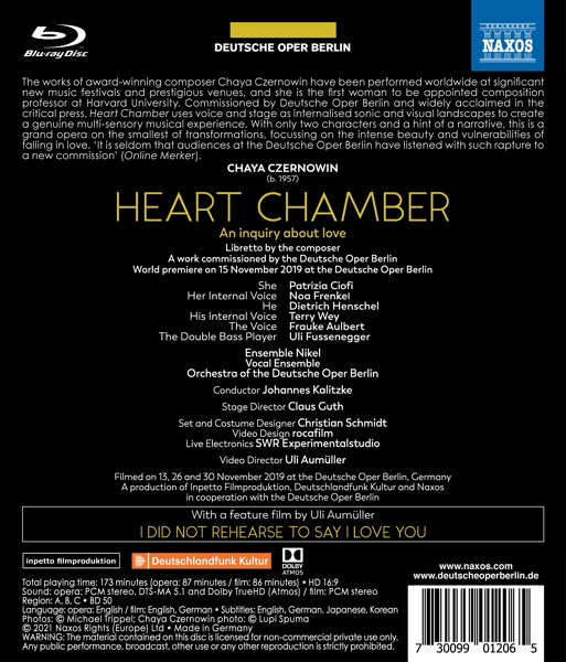 | Beschreibung: | The works of award-winning composer Chaya Czernowin have been performed worldwide at significant new music festivals and prestigious venues, and she is the first woman to be appointed composition professor at Harvard University. Commissioned by Deutsche Oper Berlin and widely acclaimed in the critical press, 'Heart Chamber' uses voice and stage as internalized sonic and visual landscapes to create a genuine multi-sensory musical experience. With only two characters and a hint of a narrative, this is a grand opera on the smallest of transformations, focusing on the intense beauty and vulnerabilities of falling in love. 'It is seldom that audiences at the Deutsche Oper Berlin have listened with such rapture to a new commission' (Online Merker). Director Uli Aumüller's feature film 'I did not rehearse to say I love you' is also included and takes a behind-the-scenes look at the creation of the opera., Runningtime: 00:00:00, Labelcode NXS120.2 |  | Darsteller: |