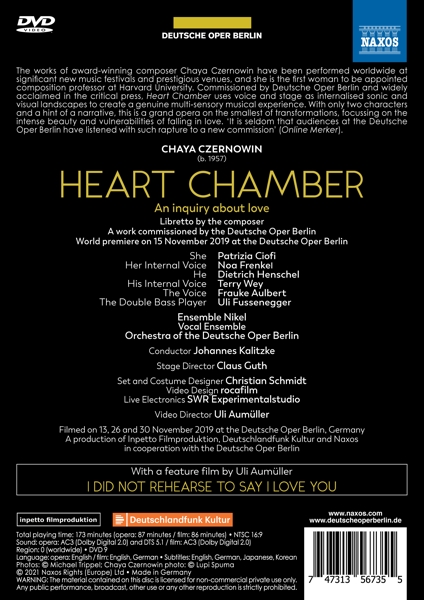 | Beschreibung: | The works of award-winning composer Chaya Czernowin have been performed worldwide at significant new music festivals and prestigious venues, and she is the first woman to be appointed composition professor at Harvard University. Commissioned by Deutsche Oper Berlin and widely acclaimed in the critical press, 'Heart Chamber' uses voice and stage as internalized sonic and visual landscapes to create a genuine multi-sensory musical experience. With only two characters and a hint of a narrative, this is a grand opera on the smallest of transformations, focusing on the intense beauty and vulnerabilities of falling in love. 'It is seldom that audiences at the Deutsche Oper Berlin have listened with such rapture to a new commission' (Online Merker). Director Uli Aumüller's feature film 'I did not rehearse to say I love you' is also included and takes a behind-the-scenes look at the creation of the opera., Runningtime: 00:00:00, Labelcode NXDV2110673.2 |  | Darsteller: |