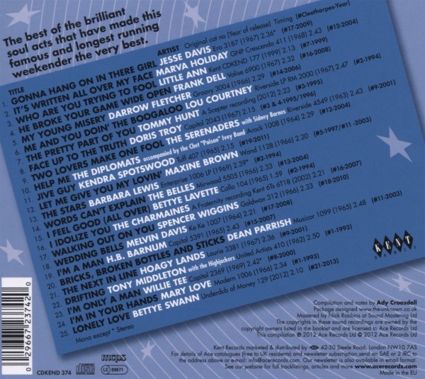 01. Davis, Jesse "Gonna hang on in there girl" 02. Holiday, Marva "It's written all over my face" 03. Little Ann "Who are you trying to fool" 04. Dell, Frank "He Broke Your Game Wide Open" 05. Fletcher, Darrow "My young misery" 06. Courtney, Lou "Me and you doin' the Boogaloo" 07. Hunt, Tommy "The pretty part of you" 08. Troy, Doris "Face up to the truth" 09. Serenaders, The / Barnes, Sidney "Two lovers make one fool" 10. Diplomats, The / Ivey, Chet "Poison" Band "Help me" 11. Spotswood, Kendra "Jive guy" 12. Brown, Maxine "Let Me Give You My Lovin'" 13. Lewis, Barbara "The Stars" 14. Belles, The "Words can't explain" 15. LaVette, Bettye "I feel good (All over)" 16. Charmaines, The "I idolize you" 17. Wiggins, Spencer "Walking out on you" 18. Davis, Melvin "Wedding Bells" 19. Barnum, H. B. "I'm a man" 20. Parrish, Dean "Bricks, broken bottles and sticks" 21. Hoagy Lands "The next in line" 22. Middleton, Tony / Highjackers, The "Drifting" 23. Tee, Willie "I'm only a man" 24. Love, Mary "I'm In Your Hands" 25. Swann, Bettye "Lonely love"