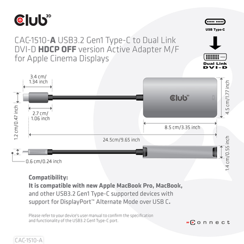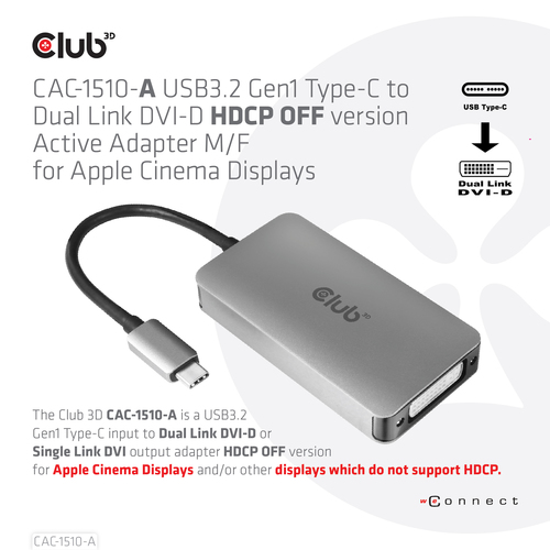 CLUB3D USB3.2 Gen1 Type-C to Dual Link DVI-D HDCP OFF version Active Adapter M/F for Apple Cinema Displays
