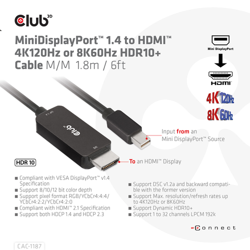 Club 3D CAC-1187 - Adapterkabel - Mini DisplayPort männlich zu HDMI männlich - 1.8 m - unterstützt 8K 60 Hz (7680