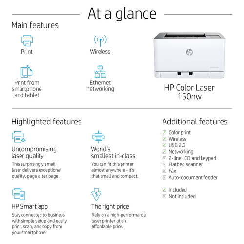 Der HP Color Laser 150nw ist ein kompakter und effizienter Farblaserdrucker für kleine Büros und Heimanwender mit hohen Ansprüchen an Druckqualität und Konnektivität. Er unterstützt das Drucken im A4-Format sowie die Verbindung über USB 2.0, LAN oder WLAN ? so lässt sich der Drucker flexibel ins Netzwerk integrieren oder direkt vom Mobilgerät aus nutzen. Mit einer Druckgeschwindigkeit von bis zu 18 Seiten pro Minute (s/w) bzw. bis zu vier Seiten pro Minute (Farbe) liefert er gestochen scharfe Texte und brillante Farben bei einer Auflösung von bis zu 600 x 600 dpi dank moderner Lasertechnologie und intuitiver Bedienung am Gerät selbst. Typische Anwendungen sind Geschäftsdokumente wie Angebote oder Rechnungen ebenso wie Präsentationen oder farbige Grafiken für Schule und Studium. HP gilt als weltweit führender Hersteller innovativer IT-Lösungen mit Fokus auf Zuverlässigkeit sowie Nachhaltigkeit: Viele Geräte bestehen anteilig aus recyceltem Kunststoff; zudem gibt es Recyclingprogramme wie ?HP Planet Partners? zur umweltgerechten Rückgabe leerer Kartuschen sowie energiesparende Designs zur Reduktion des Stromverbrauchs. Mit dem Kauf des HP Color Laser 150nw investieren Sie nicht nur in professionelle Drucktechnik ? Sie leisten auch einen aktiven Beitrag zum Umweltschutz durch nachhaltige Herstellungsprozesse!