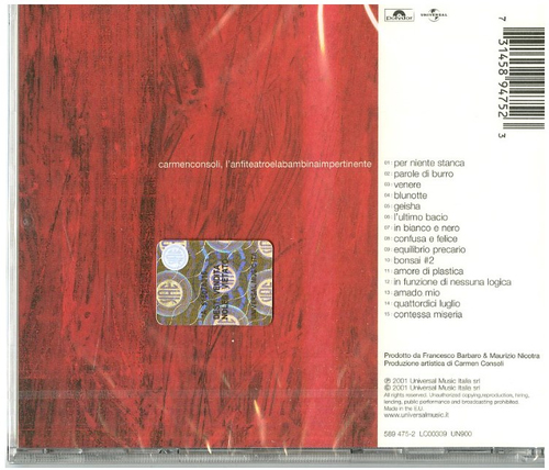 "L'anfiteatro E La Bambina Im" ist eine eindrucksvolle CD-Veröffentlichung der renommierten italienischen Singer-Songwriterin Carmen Consoli und erscheint beim Label Universal. Das Album besticht durch poetische Texte und gefühlvolle Melodien und nimmt die Hörer mit auf eine musikalische Reise voller Erinnerungen, Identitätssuche und Emotionen. Die Songs zeichnen sich durch ihre vielschichtige Instrumentierung sowie tiefgründiges Storytelling aus ? ein echtes Highlight der zeitgenössischen italienischen Musikszene. Universal zählt zu den weltweit führenden Musikunternehmen und steht für hochwertige Produktionen sowie die Förderung vielfältiger Künstlerinnen und Künstler verschiedenster Genres. Carmen Consoli gilt als eine der bedeutendsten Musikerinnen Italiens: Mit mehreren Platin-Alben und Auszeichnungen wie dem Targa Tenco hat sie internationale Anerkennung erlangt.