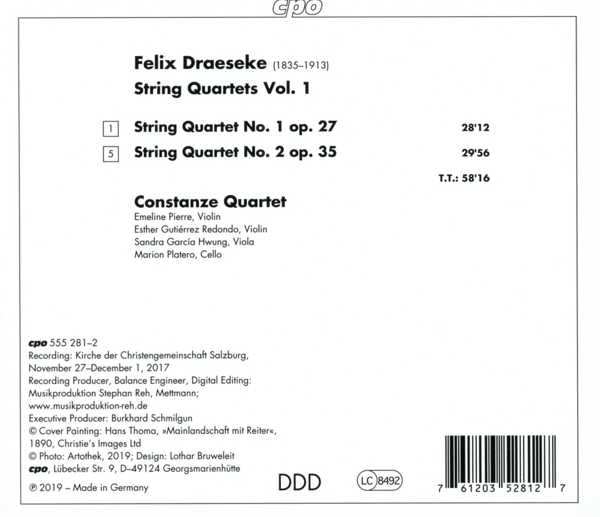 Beschreibung:Cello [Constanze Quartet]: Marion Platero, Composed By: Felix Draeseke, Design: Lothar Bruweleit, Ensemble: Constanze Quartet, Executive-Producer: Burkhard Schmilgun, Liner Notes: Norbert Florian Schuck, Liner Notes [Translated By]: J. Bradford Robinson, Painting [Cover Painting]: Hans Thoma, Producer [Recording Producer], Engineer [Balance Engineer], Edited By [Digital Editing]: Musikproduktion Stephan Reh, Viola [Constanze Quartet]: Sandra García Hwung, Violin [Constanze Quartet]: Emeline Pierre, Violin [Constanze Quartet]: Esther Guitérrez Redondo, Labelcode CPO555281.2 (555 281-2), Record Company Classic Produktion Osnabrück, Phonographic Copyright (p) cpo, Copyright (c) Hans Thoma, Copyright (c) Artothek, Recorded At Kirche Der Christengemeinschaft Salzburg, Glass Mastered At Arvato