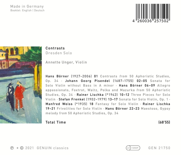 Beschreibung:From the very first note, violinist Annette Unger's new GENUIN album will captivate you with an eclectic program featuring early and contemporary music from Dresden, full of electrifying contrasts. The oldest composition is by Bach contemporary Johann Georg Pisendel, while the most recent by Manfred Weiss was premiered by Annette Unger as recently as 2015. Aside from Pisendel's great work, all the other pieces in this production are world premiere recordings. Annette Unger, who plays flawlessly and with a wealth of color, presents a kaleidoscope of violinistic possibilities, compositional ideas, and intellectual approaches to music, intimately connected to the musical city of Dresden., Runningtime: 00:00:00, Violin: Annette Unger, Composed By: Hans Börner (2), Composed By: Johann Georg Pisendel, Composed By: Hans Börner (2), Composed By: Rainer Lischka, Composed By: Stefan Frenkel, Composed By: Manfred Weiss, Composed By: Rainer Lischka, Composed By: Hans Börner (2), Labelcode GENN21750.2 (GEN 21750), Phonographic Copyright (p) Genuin Classics, Copyright (c) Genuin Classics
