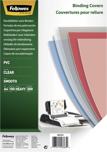 Der Artikel "Deckblatt A4 transparent 300 Mikron" von Fellowes wird geliefert mit 100 Stück(e) pro Packung, ist Transparent, besteht aus folgendem Material: PVC und hat die Abmasse von Höhe 297 mm x Breite 210 mm x Tiefe 1 mm.
