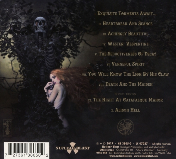 01. "Exquisite Torments Await" 02. "Heartbreak And Seance" 03. "Achingly Beautiful" 04. "Wester Vespertine" 05. "The Seductiveness Of Decay" 06. "Vengeful Spirit" 07. "You Will Know The Lion By His Claw" 08. "Death And The Maiden" 09. "The Night At Catafalque Manor" 10. "Alison Hell"