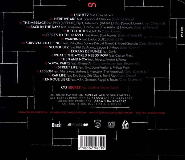 01. Crown / Grand Agent "I squeez" 02. Crown / Soulstice / Mainflow "Here we are" 03. Crown / PMD / Flynt / Akhenaton / Lil Dap "The message" 04. Crown / Kouzumin / El Da Sensei / Paloalto "Back in the dayz" 05. Crown / RADIx "R to the x" 06. Crown / Rasco "Pieces to the puzzle" 07. Crown / Dadoo "Warning" 08. Crown / Reks / Kool Sphere / Krumb Snatcha "Survival challenge" 09. Crown / Phil Da Agony / Saigon / J-Hood "No doubtz" 10. Crown / Scylla "cranz de fum?e" 11. Crown / Caxton Press "What's the world needs now" 12. Crown / Tribeca / Kwote1 / Prime "Then & now" 13. Crown / Rhyme -A- "W.W.W. Part2" 14. Crown / Gys / Demi Portion / Phileas Flow "Street life" 15. Crown / Masta Ace / Vorheez / Freestyle "Lesson" 16. Crown / Sosa, Eric / Clap, Otis / Top $ Raz "Rap life" 17. Crown / A.T.K. / Gwenzel / Fay?al / Tupan "En roue libre"