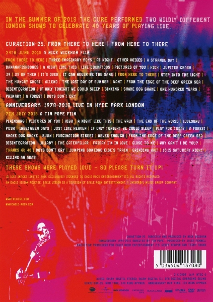 Beschreibung:Runningtime: 00:00:00, Coordinator, Post Production: Ben Northey (2), Director Of Photography: Ben Frewin, Director Of Photography: Dax Debice, Editor: Mark "Reggie" Wrench, Editor: Tim Woolcott, Editor [Colourist]: Max Horton, Editor [Colourist]: Tom Knowles (3), Editor [Online]: Adam Sample, Editor [Online]: Tom Knowles (3), Executive-Producer [For Eagle Rock Entertainment Ltd]: Geoff Kempin, Executive-Producer [For Eagle Rock Entertainment Ltd]: Terry Shand (3), Film Director: Tim Pope, Film Director, Film Producer: Nick Wickham, Film Producer: Jules Fennell, Guitar: Reeves Gabrels, Guitar: Robert Smith, Lighting Director [FOH Lightning Director, For Curætion-25]: Angus Macphail, Lighting Director [FOH Lightning Director, For The Cure]: Angus Macphail, Mastered By: Andrew Walter, Mixed By [Assistant]: Mark Lord, Mixed By [Audio Mix]: Paul Corkett, Mixed By [Audio Mix]: Robert Smith, Mixed By [Dubbing Mixer]: Wid (3), Performer, 6-String Bass [V1Bass]: Reeves Gabrels, Performer, 6-String Bass [V1Bass]: Robert Smith, Performer, Bass: Simon Gallup, Performer, Drums: Jason Cooper, Performer, Flute [Uncredited]: Robert Smith, Performer, Harmonica [Uncredited]: Robert Smith, Performer, Keyboards: Roger O'Donnell, Performer, Shaker [Uncredited]: Roger O'Donnell, Performer, Tambourine [Uncredited]: Roger O'Donnell, Post Production: Onsight, Post Production: The Joint (6), Post Production, Supervised By: Jeff Halsey (2), Production Manager [For Curætion-25]: Philip Broad, Production Manager [For The Cure]: Philip Broad, Sounds [FOH Sound, For Curætion-25]: Paul Corkett, Sounds [FOH Sound, For The Cure]: Paul Corkett, Vocals: Robert Smith, Written-By: Boris Williams, Written-By: Jason Cooper, Written-By: Laurence Tolhurst, Written-By: Matthieu Hartley, Written-By: Michael Dempsey, Written-By: Perry Bamonte, Written-By: Porl Thompson, Written-By: Robert Smith, Written-By: Roger O'Donnell, Written-By: Simon Gallup, Labelcode 0413708 (EREDV1370, 5034504137080), Phonographic Copyright (p) Lost Images Limited, Copyright (c) Lost Images Limited, Licensed To Eagle Rock Entertainment Ltd., Record Company Universal Music Group, Recorded At Meltdown Festival, Filmed At Meltdown Festival, Recorded At Hyde Park, Filmed At Hyde Park, Mixed At Brighton Electric Studios, Mastered At Abbey Road Studios