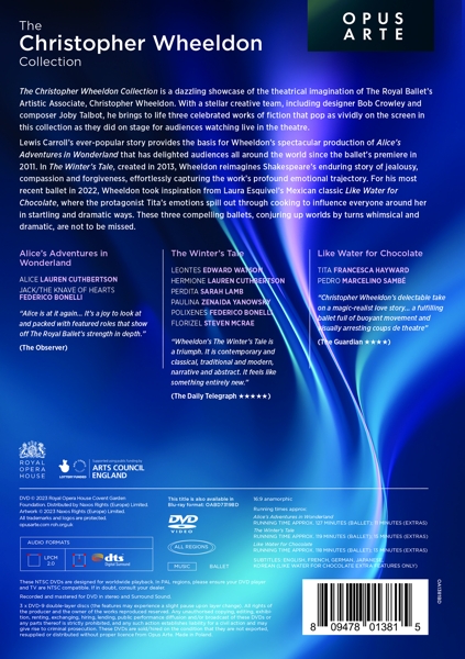 Beschreibung:The Christopher Wheeldon Collection showcases three of Wheeldon's most acclaimed recent productions for The Royal Ballet, including Alice's Adventures in Wonderland (2018), The Winter's Tale (2014) and Like Water for Chocolate (2022). Lewis Carroll's ever-popular story provides the basis for Wheeldon's spectacular production of Alice's Adventures in Wonderland. Bob Crowley's vivid sets and costumes take us down the rabbit hole into a colourful world full of curious creatures and captivating characters. Joby Talbot's original score is full of sweeping melodies and contemporary sounds. Lauren Cuthbertson stars as the inquisitive Alice, with Federico Bonelli as the charming Knave of Hearts, Steven McRae as the tap-dancing Mad Hatter and Laura Morera as the formidable Queen of Hearts. This exuberant and engaging ballet is spectacular entertainment for the whole family. Wheeldon drew on the same music and design team to create an evocative reimagining of The Winter's Tale, Shakespeare's enduring story of jealousy, compassion and forgiveness. The staging effortlessly captures the work's profound emotional trajectory, with powerful designs by Crowley, Talbot's skilful score and Wheeldon's constantly inventive choreography. Strong company performances-among them Edward Watson's Leontes, Zenaida Yanowsky's Paulina and Sarah Lamb's Perdita-put the finishing touches to a gleaming production. In Like Water for Chocolate, a modern Mexican classic provides the basis for a theatrical tale of love, jealousy, repression, and revolution. The 2022 production reunited Wheeldon with Talbot and Crowley, now an established and stellar creative team. Inspired by Laura Esquivel's novel, the central character's emotions spill out through cooking to influence everyone around her in startling and dramatic ways. The full Company, led by Francesca Hayward as Tita and Marcelino Sambe as Pedro, reshape this captivating family saga into a richly layered and engrossing new ballet where passion, mystery and magic combine., Runningtime: 00:00:00, Labelcode BOPU1381CDVD
