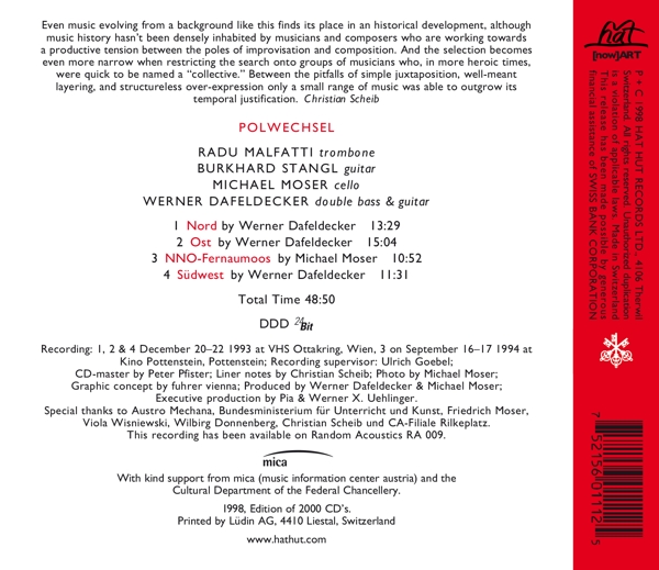 | Beschreibung: | Cello: Michael Moser, Design Concept [Graphic Concept]: fuhrer vienna, Double Bass, Guitar: Werner Dafeldecker, Executive-Producer: Pia & Werner X. Uehlinger, Guitar: Burkhard Stangl, Liner Notes: Christian Scheib, Mastered By [CD-master]: Peter Pfister, Photography By [Photo]: Michael Moser, Producer [Produced By]: Michael Moser, Producer [Produced By]: Werner Dafeldecker, Recorded By [Recording Supervisor]: Ulrich Goebel, Text By [Prose Poem]: Werner Dafeldecker, Trombone: Radu Malfatti, Composed By: Werner Dafeldecker, Composed By: Werner Dafeldecker, Composed By: Michael Moser, Composed By: Werner Dafeldecker, Labelcode HAHT112.2 (hat[now]ART 112), Phonographic Copyright (p) Hat Hut Records Ltd., Copyright (c) Hat Hut Records Ltd., Printed By Lüdin AG, Recorded At VHS Ottakring, Recorded At Kino-Pottenstein, Pottenstein |