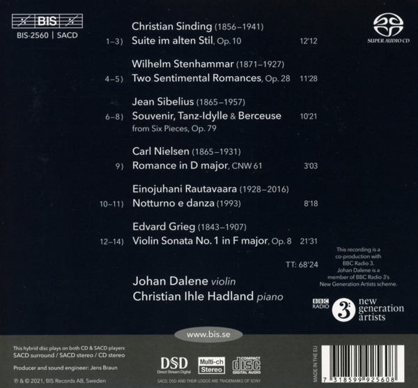 Beschreibung:Only 20 years old, Johan Dalene has already been hailed as 'a musician of special sensibilities' (Gramophone) in possession of 'a rare fire' (Diapason), and his début disc, with the concertos of Tchaikovsky and Barber, was described as 'one of the finest violin débuts of the last decade' in the BBC Music Magazine. For his second album, the Swedish violinist has chosen repertoire closer to home, with works by six Nordic composers. This is music that lies equally well under the hands of his partner, the Norwegian pianist Christian Ihle Hadland, and together the two offer a program full of contrasts, and yet with a certain consistent sensibility. Nordic Rhapsody is bookended by two Norwegian composers, Christian Sinding and Edvard Grieg. What is interesting is that even though Sinding's Suite 'in the old style' was composed some 25 years after Grieg's Sonata No. 1, it is the latter work that is most forward-looking. Here the composer introd-uces elements of his national style, which in turn would contribute to the development of 'a Nordic style'. Following on the heels of Sinding is a Swedish-Finnish-Danish trio with personal ties - Wilhelm Stenhammar was a close friend of both Sibelius and Nielsen, whose music inspired him to free himself from Central European influences. His Romances and the three miniatures by Sibelius were composed during the 1910s, while Nielsen's Romance in D major is a youthful work offering Dalene - winner of the 2019 Nielsen Competition - the opportunity to send a greeting to the composer. Last but not least among these composers, Einojuhani Rautavaara represents a great leap in time. His music is often described as synonymous with a contemporary 'Nordic style', however, and the transition from Notturno e danza (1993) to Grieg's Sonata is as smooth as the ice on a Finnish lake in winter., Runningtime: 00:00:00, Executive-Producer: Robert Suff, Piano: Christian Ihle Hadland, Producer: Jens Braun, Violin: Johan Dalene, Composed By: Christian Sinding, Composed By: Christian Sinding, Composed By: Christian Sinding, Composed By: Wilhelm Stenhammar, Composed By: Wilhelm Stenhammar, Composed By: Jean Sibelius, Composed By: Jean Sibelius, Composed By: Jean Sibelius, Composed By: Carl Nielsen, Composed By: Einojuhani Rautavaara, Composed By: Einojuhani Rautavaara, Composed By: Edvard Grieg, Composed By: Edvard Grieg, Composed By: Edvard Grieg, Labelcode BIS2560.2 (BIS-2560 SACD)