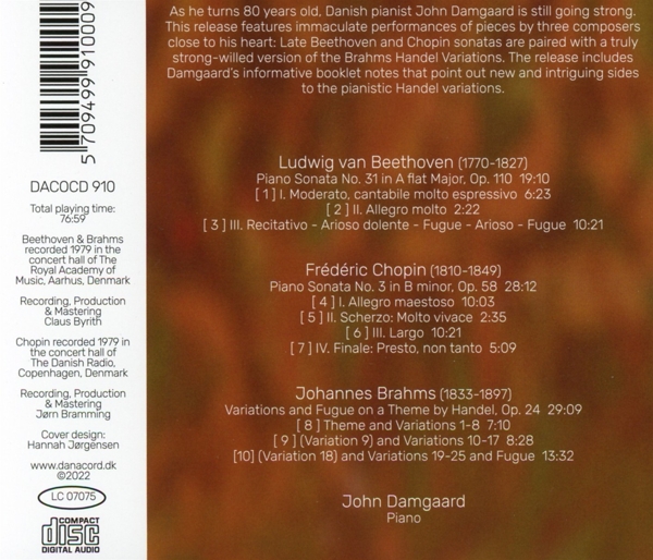 Beschreibung: | As he turns 80 years old, Danish pianist John Damgaard is still going strong. This release features immaculate performances of pieces by three composers close to his heart: Late Beethoven and Chopin sonatas are paired with a truly strong-willed version of the Brahms Handel Variations. The release includes Damgaard's informative booklet notes that point out new and intriguing sides to the pianistic Handel variations. A release for all lovers of great piano playing. The Danish pianist John Damgaard (1941-) studied at Eastman School of Music (New York), The Royal Danish Conservatory of Music in Copenhagen with Georg Vasarhelyi and later with Ilona Kabos in London and Wilhelm Kempff in Italy. From 1969-1984 John Damgaard was assistant professor at The Royal Danish Academy of Music and 1979-81 guest professor at Musashino Academia Musicae in Tokyo, Japan. From 1984-2005 he held the academic position of professor at The Royal Academy of Music, Aarhus. John Damgaard has given concerts in USA, Canada, Mexico, Russia, Estonia, Latvia, Lithuania, Italy, France, Belgium, Japan, Australia, primarily with classical, romantic programs, but almost always including Danish piano works. He has performed more than 31 different piano concerti., Runningtime: 00:00:00, Labelcode DAN910.2 |