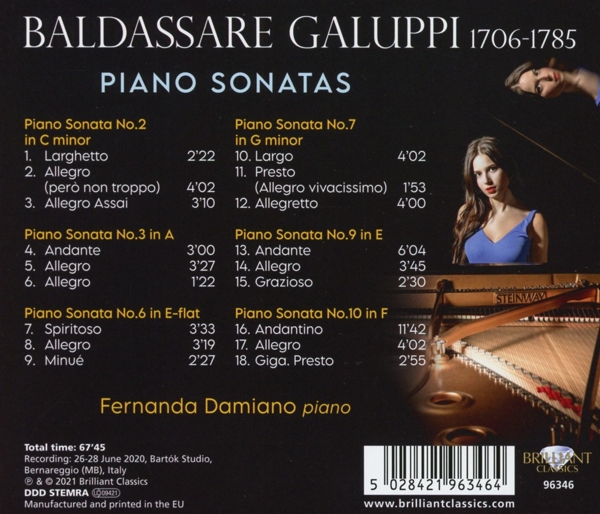 Beschreibung:At a time when only Bach and Scarlatti were Baroque-era composers in the repertoire of pianists rather than harpsichordists, Arturo Benedetti Michelangeli pressed the cause of Baldassare Galuppi (1706-1785) with performances and recordings of sonatas. Galuppi's style was defined during his lifetime as 'gay, lively and brilliant', and this description certainly capture the style of the keyboard sonatas which he wrote throughout his career. Born on the island of Burano in the Venetian lagoon, Galuppi trained with Antonio Lotti (then organist of the Basilica San Marco) and quickly became noted across Europe for a string of operatic successes which supplied both audiences and singers with dazzling entertainment. He was no musical revolutionary and continued to compose in a well-turned vein of elegant Baroque conventions while composers further north in Europe were experimenting with larger-scale forms and more daring harmonies. However, the keyboard sonatas which Galuppi wrote throughout his career delighted audiences at the time and have continued to do so since. Several collections were issued during his lifetime (and designated with Opus numbers) but a great deal of his keyboard music remains unpublished. Collection of 12 three-movement sonatas, drawn from this otherwise unpublished body of work, was edited by Giacomo Benvenuti (1885-1943) and issued by the Francesco Bongiovanni publishing house in 1920, and it is from this collection (familiar to audiences of the 50s through Michelangeli) that Fernanda Damiano plays six sonatas on the present album., Runningtime: 00:00:00, Labelcode BRLT96346.2