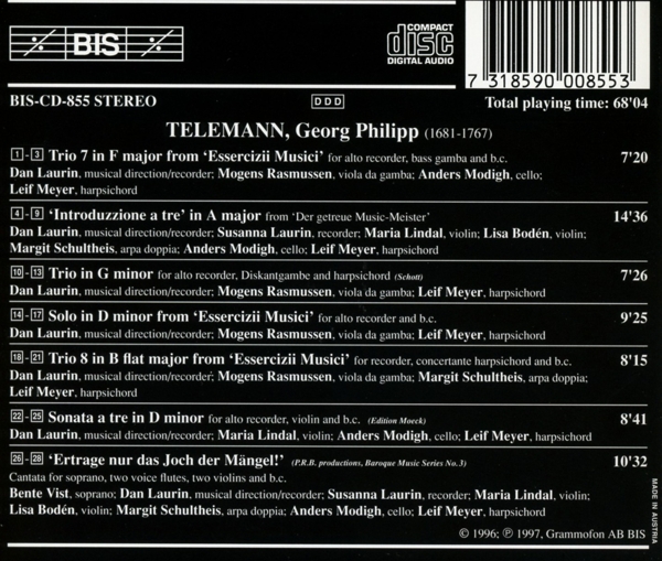 Essercizii Musici: Trio Nr. 7 F-Dur 01. Laurin, Dan "1. Vivace" 02. Laurin, Dan "2. Mesto" 03. Laurin, Dan "3. Allegro" Der Getreue Music-Meister: Introduktion a 3 A-Dur 04. Laurin, Susanna "1. Grave - Vivace - Andante - Vivace" 05. Laurin, Susanna "2. Xantippe" 06. Laurin, Susanna "3. Lucretia" 07. Laurin, Susanna "4. Corinna" 08. Laurin, Susanna "5. Clelia" 09. Laurin, Susanna "6. Dido" Trio für Blockfl?te, Viola da Gambe und Cembalo g-moll 10. Laurin, Dan "1. Soave ma non adagio" 11. Laurin, Dan "2. Vivace" 12. Laurin, Dan "3. Largo" 13. Laurin, Dan "4. Allegro" Essercizii Musici: Solo für Blckfl?te d-moll 14. Laurin, Dan "1. Affettuoso" 15. Laurin, Dan "2. Presto" 16. Laurin, Dan "3. Grave" 17. Laurin, Dan "4. Allegro" Essercizii Musici: Trio Nr. 8 B-Dur 18. Laurin, Dan "1. Dolce" 19. Laurin, Dan "2. Vivace" 20. Laurin, Dan "3. Siciliana" 21. Laurin, Dan "4. Vivace" Sonate a tre d-moll (für Blockfl?te, Violine und Basso continuo) 22. Laurin, Dan "1. Allegro" 23. Laurin, Dan "2. Adagio" 24. Laurin, Dan "3. Allegro" 25. Laurin, Dan "4. Presto" Entrage nur das Joch der M?ngel! (Kantate) 26. Vist, Bente "Arie: Largo" 27. Vist, Bente "Rezitativ" 28. Vist, Bente "Arie: Presto"