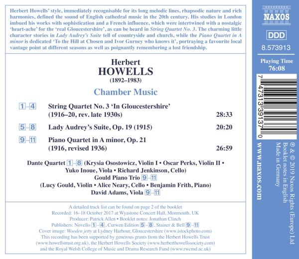 Streichquartett Nr. 3 "In Gloucestershire" 01. Dante Quartet "1. With easy and flexible movement" 02. Dante Quartet "2. Fairly quick, but always rhytmical" 03. Dante Quartet "3. Slow in pace, with much feeling" 04. Dante Quartet "4. Allegro vivace: Assai ritmico" Suite für Streichquartett op. 19 "Lady Audrey's" 05. Dante Quartet "1. The four sleepy golliwogs' dance" 06. Dante Quartet "2. The little girl and the old shepherd" 07. Dante Quartet "3. Prayer-time" 08. Dante Quartet "4. The old shepherd's tale" Quartett für Klavier und Streicher op. 21 09. Adams, David "1. Allegro moderato, tranquillo" 10. Adams, David "2. Lento, molto tranquillo" 11. Adams, David "3. Allegro molto, energico"