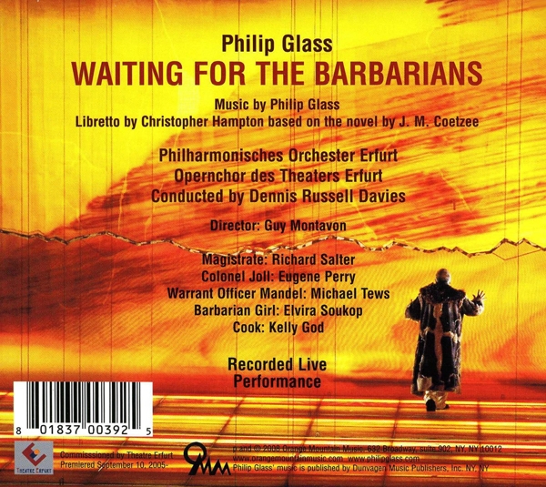 Disc 01 Waiting For The Barbarians (von Christopher Hampton nach J. M. Coetzee) (Oper in 2 Akten) 01. "1. Akt, 1: Prelude" 02. "1. Akt, 2: In Fact, We Never Had A Prison" 03. "1. Akt, 3: Dreamscape No. 1" 04. "1. Akt, 4: You Sent For Me" 05. "1. Akt, 5: You#re Working Late" 06. "1. Akt, 6: Normally Speaking, We Would Never Approve Of Torture" 07. "1. Akt, 7: Take Off Your Cap" 08. "1. Akt, 8: Dreamscape No. 2" 09. "1. Akt, 9: Do You Like Living In The Town?" 10. "1. Akt, 10: To Demonstrate Our Strength To The Barbarians" 11. "1. Akt, 11: Dreamscape No. 3" 12. "1. Akt, 12: What Is It?" 13. "1. Akt, 13: Can You See Them?" 14. "1. Akt, 14: Who Gave Permission To Desert Your Post?"