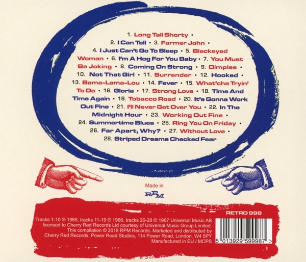 01. "Long tall shorty" 02. "I can tell" 03. "Farmer John" 04. "I just can't go to sleep" 05. "Black-eyed woman" 06. "I'm a hog for you baby" 07. "You must be joking" 08. "Coming on strong" 09. "Dimples" 10. "Not that girl" 11. "Surrender" 12. "Hooked" 13. "Bama-lama-lou" 14. "Fever" 15. "Wat'cha tryin' to do" 16. "Gloria" 17. "Strong love" 18. "Time and time again" 19. "Tobacco road" 20. "It's gonna work out fine" 21. "I'll never get over you" 22. "In the midnight hour" 23. "Working out fine" 24. "Summertime blues" 25. "Ring you on Friday" 26. "Far apart, why?" 27. "Without love" 28. "Striped dreams checked fear"
