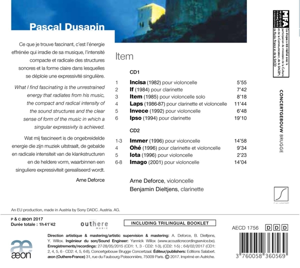 Disc 01 01. Deforce, Arne "Incisa (für Violoncello)" 02. Dieltjens, Benjamin "If (für Klarinette)" 03. Deforce, Arne "Item (für Violoncello)" 04. Dieltjens, Benjamin "Laps (für Klarinette und Violoncello)" 05. Deforce, Arne "Invece (für Violoncello)" 06. Dieltjens, Benjamin "Ipso (für Klarinette)"